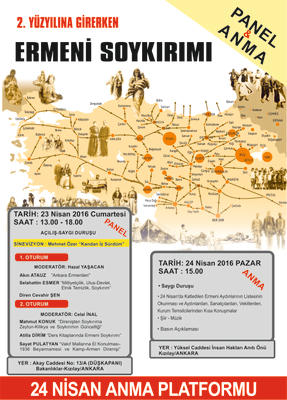 Ankara’da 24 Nisan Anma Platformu bir panel ve anma yürüyüşü düzenleyecek. 23 Nisan’da ‘2. Yüzyılına Girerken Ermeni Soykırımı’ başlıklı bir panel düzenlenecek; 24 Nisan’daysa saat 15.00’te Yüksel Caddesi İnsan Hakları Anıtı önünde, 24 Nisan’da tutuklanan ve öldürülen Ermeni aydınlarının isimleri okunarak Soykırım kurbanları anılacak.