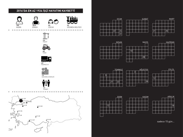 Ulusal basına yansıyan haberleri derleyen almanağa göre, 2016 yılında en az 1924 işçi çalışırken hayatını kaybetti, her ay neredeyse her gün iş cinayeti yaşandı.