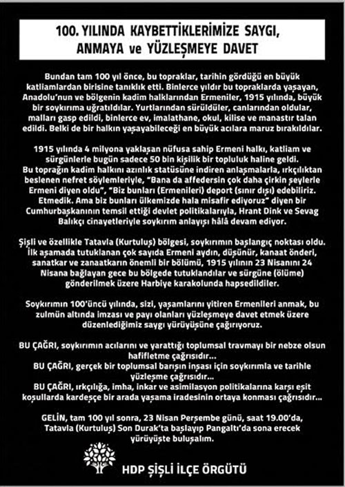 HDP Şişli İlçe Örgütü’nün bu yıl üçüncüsünü düzenleyeceği 23,5 Nisan anması, ‘’gerçek bir toplumsal barışın inşası için soykırımla ve tarihle yüzleşme’’ çağrısıyla gerçekleşecek. Saat 19:00’da soykırımın başlangıç noktası olarak kabul edilen Tatavla (Kurtuluş) son durakta başlayacak yürüyüş, ellerde mor kurdeleli mumlar ve karanfiller ile Pangaltı metro durağında sona erecek. İlk tutuklanan aydınların resimlerinin taşınacağı yürüyüş boyunca, İstanbul dışında dünyadaki Ermeni Kiliseleri’nde 24 Nisan ayininde yapılacağı gibi 100 defa çan çalınacak. HDP 2. bölge milletvekili adayları ve ilçe eş başkanlarının da katılacağı anmada Onnik Dinçyan’ın iki kilise ilahisi ve duduk dinletisi olacak. 23,5 Nisan anma programı dilek fenerlerinin uçurulması ve yapılacak basın açıklaması ile son bulacak.