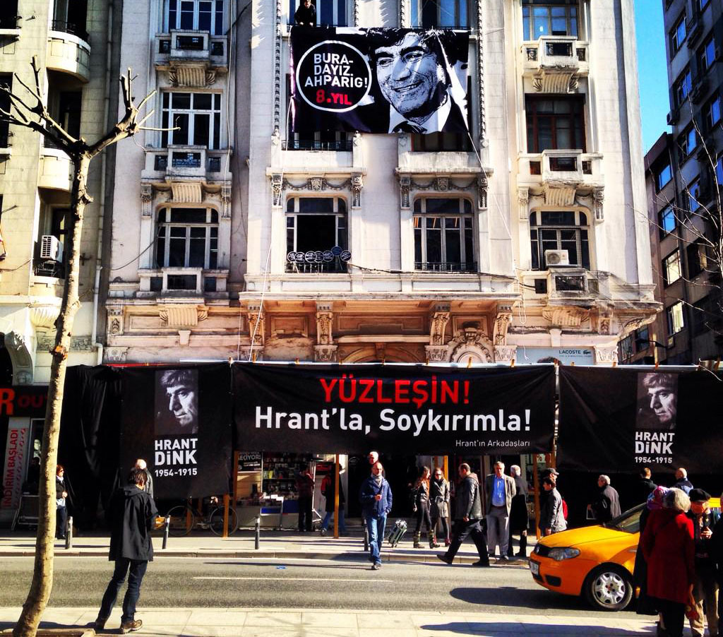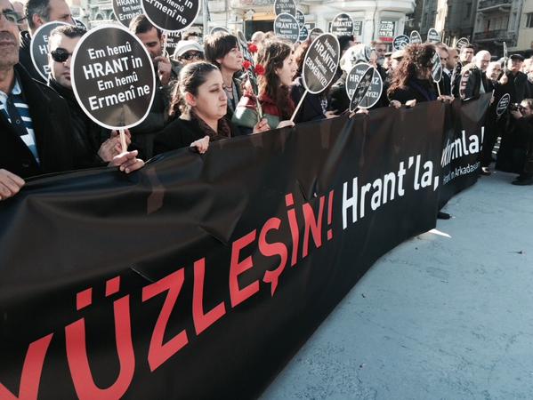 Taksim’de kalabalık toplanmaya başladı. Hrant’ın Arkadaşları’nın 2015 anması için hazırladığı ‘Yüzleşin! Hrant’la Soykırımla’ sloganının yazıldığı pankartın arkasında kalabalık toplanıyor.