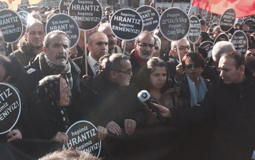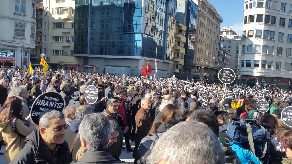 Taksim'den binler Agos'un önüne yürümeye başladı. kortejin başında Dink ailesi, HDP Esbaskanlari Selahattin Demirtas ve Figen Yuksekdag, CHP milletvekilleri Umut Oran, Sezgin Tanrıkulu, Şafak Pavey yer alıyor.