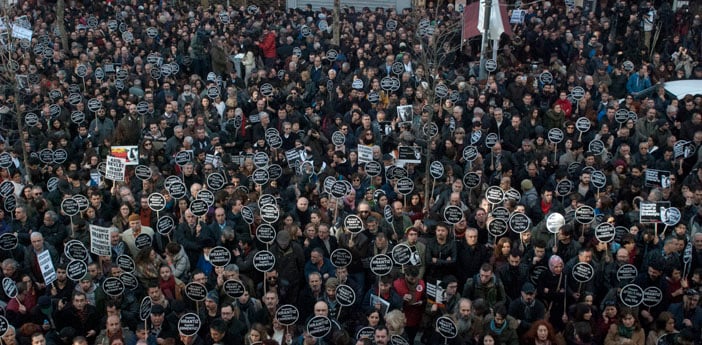 Hrant Dink'in 'gözlerini' taşıyan bir grup. Göz görselleri, Charlie Hebdo saldırısı sonrası dergiyle dayanışma eylemleri sırasında dünyanın pek çok yerinde kullanmış, katledilen çizerlerin gözleri pankart gibi taşınmıştı.