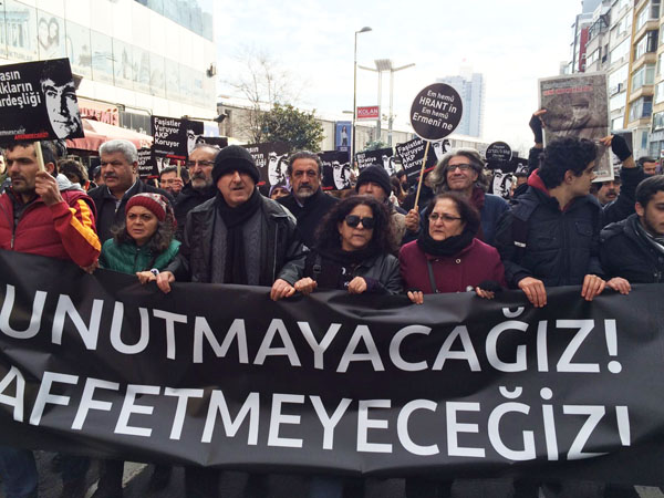 Հարյուրավոր մարդիկ են հավաքվել՝ հարգելու Հրանտ Դինքի հիշատակը։ Նրանց մեջ են Սաբահաթ Թունջելը, Ֆերհաթ Թունչը, Սելինա Դողանը, Սեզգին Թանրըքուլուն, Կարո Պայլանը, Սելահաթթին Դեմիրթաշը, Գամզե Իլգեզդին, Թյուրքան Էլչին և Սամի Էլվանը։