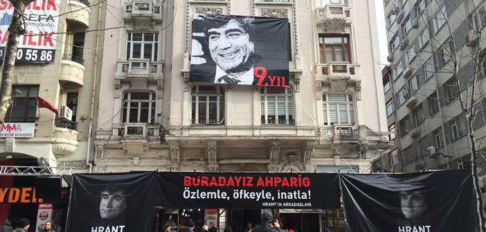 Karanlığı büyütmeye çalışanlara karşı, 9 yıldır olduğu gibi, inatla yine buradayız. Hrant Dink’in ilmek ilmek ördüğü ve uğruna hayatını verdiği barış ve hakikat dilini anımsamak ve sesine ses katmak için, bir kez daha, 19 Ocak’ta, saat 14.30’da vurulduğu yerde, Agos’un önündeyiz.