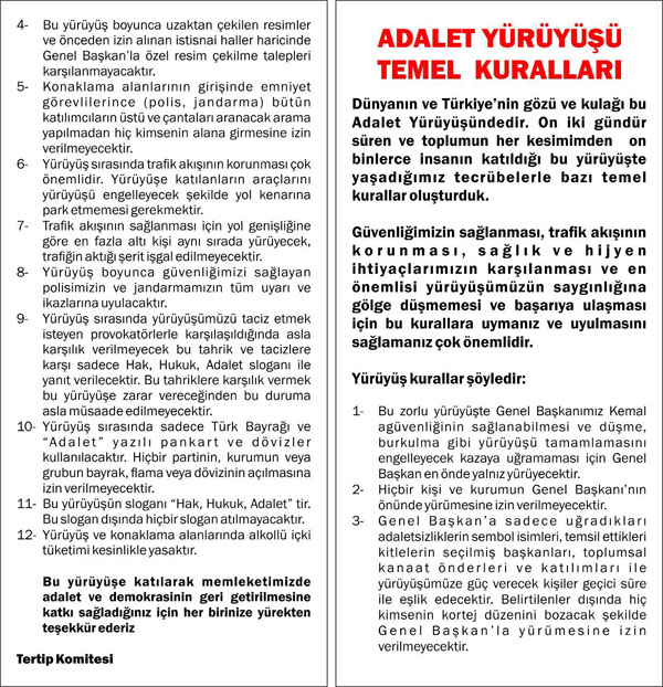 Basın toplantısında konuşan Kılıçdaroğlu, provokasyonlara karşı hazırladıkları 12 maddelik genelgeyi, yürüyüşe katılan herkese dağıtacaklarını açıkladı. Yürüyüş sırasında yapılan protestolara karşı sadece alkışlanması kararı verildi.