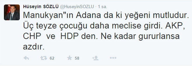 Adana Büyükşehir Belediye Başkanı Hüseyin Sözlü, meclise girmiş üç Ermeni milletvekili için twitter’dan ırkçı mesajlar attı. Sözlü, gelen tepkiler üzerine mesajını sildi.