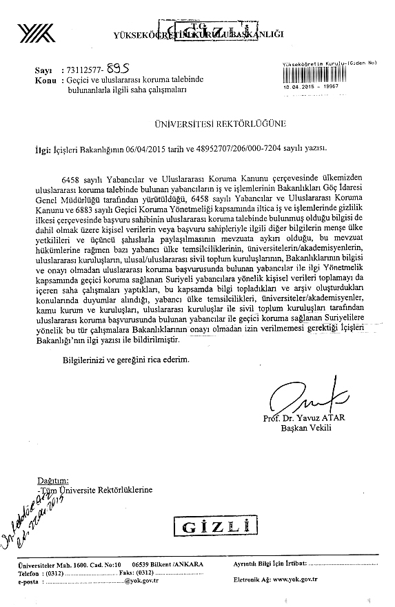 Yüksek Öğretim Kurulu Başkanlığı’nın (YÖK), tüm üniversitelere gönderdiği yazıda, Suriyelilerle ilgili araştırma yapılmasını İçişleri Bakanlığı’nın iznine tâbi kılındığını bildirmesi, tartışma yarattı. 10 Nisan 2015 tarihli yazıda, bu izne gerekçe olarak, Suriyeli yabancılara yönelik kişisel verileri toplamayı da içeren saha çalışmaları yapıldığına dair alınan duyumlar gösterildi. YÖK, bu kararın, çalışmalarda elde edilen bilgilerin üçüncü kişilerle paylaşılmasının Suriyeli mültecilerin tâbi olduğu 6458 sayılı Yabancılar ve Uluslararası Koruma Kanunu’na aykırı olduğu gerekçesiyle alındığını belirtti. İçişleri Bakanlığı’na bağlı Göç İdaresi’nin isteğiyle alındığı bilinen karar, üniversiteler ve akademisyenlerin yanı sıra “yabancı ülke temsilcilikleri, kamu kurum ve kuruluşları, uluslararası kuruluşlar ile sivil toplum kuruluşları”nın çalışmalarını da kapsıyor.