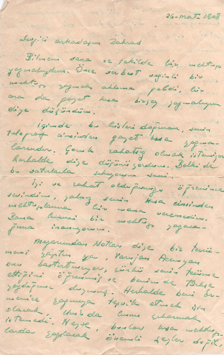 Mezarımdan Notlar diye bir tercümemi yaptın ya, Varujan Acemyan onu bastırtmıyor, çünkü senin tercüme ettiğini öğrenmiş ve benim de Türkçe yazdığımı duymuş. Herhalde beni Ermenice yazmaya teşvik etmek için olacak, Սանda bunu çıkarmak istemedi. Neyse, bunlar kısa mektuplarda yazılacak önemli şeyler değil.