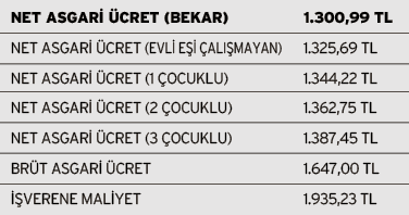 Asgari ücretin işverene maliyeti 1.935,23 TL olarak hesaplanıyor. Ancak bu maliyet hesabında işverenlerin beş puanlık sosyal güvenlik prim indirimden yararlandıkları kabul ediyoruz. Beş puanlık indirimden yararlanma şartlarını taşımayan işverenler için maliyet 1.935,23 TL değil, 2.017,58 TL oluyor. Bunun yanında SGK primi yüzde 15,5 yani işveren payı 255,29, işveren işsizlik sigorta fonu ise 32,94 TL oldu. Toplam maliyetinin 110 TL’si yararlanma koşullarına göre hazine tarafından karşılanacak. Bu konunun bir tebliğ ile açıklanmasını bekliyoruz.