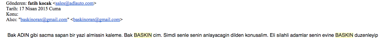 Fatih Kocak ismiyle ve "[email protected]" adresinden Baskın Oran'ın e-mailine 17 Nisan 2015'de gönderilen elektronik postada Oran'a çok ağır küfürler ve öldürme tehdidi yer aldı. Oran'ın bu tehdit ve hakaret içeren mail için yaptığı suç duyurusu üzerine soruşturma açıldı. Soruşturmayı yürüten savcı Cevat İşlek, şaşırtıcı biçimde takipsizlik kararı verdi.