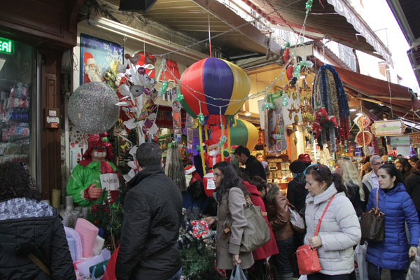 Tarihî Mahmutpaşa Çarşısı’na girmemizle beraber, Noel Baba biçiminde gözlükler, süsler, ışıklar gözümüze çarpıyor. Mahmutpaşa esnafı, çeyiz ve sünnet malzemeleriyle dolu olan vitrinlerini değiştirip, yeni yıl için düzenlemişler. Satışların nasıl gittiğini sorduğumuz esnaftan farklı tepkiler alıyoruz. Kimi neredeyse izdiham yaşandığını söylüyor, kimiyse yılbaşı geleneğinin artık kalmadığından yakınıyor.