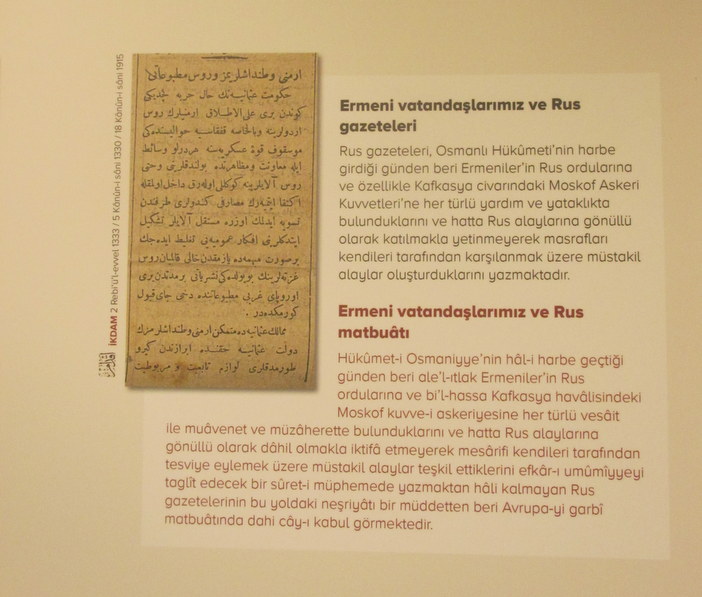 Osmanlı toplumunda “iç mihrak” olarak gösterilen Ermeniler için “hainlik” algısı ise bir başka haberle yaratılıyor. 18 Ocak 1915’te İkdam’daki kupürde Rus gazetelerine dayanılarak, Osmanlı Hükümeti’nin savaşa girdiği günden beri Ermeniler’in Rus ordularına yardım ettiği ifade ediliyor: “…hatta Rus alaylarına gönüllü olarak katılmakla yetinmeyerek masrafları kendileri tarafından karşılanmak üzere müstakil alaylar oluşturduklarını yazmaktadır.”