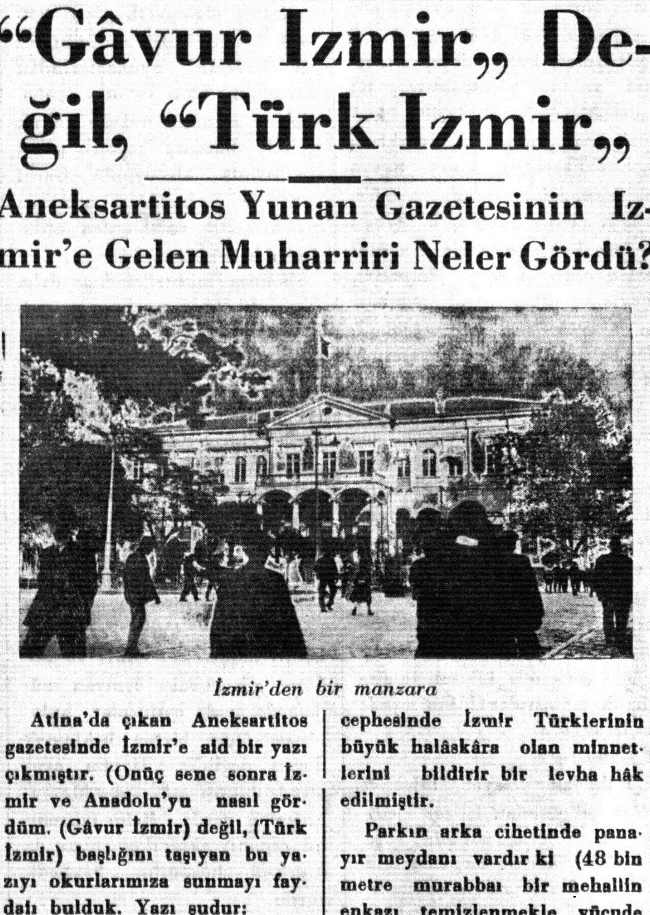 ''Bıraktığım gün Kordonun salaşlı kahvelerinde kitaralar çalınıyor, mest ve mahmur bir kalabalık Türk’e diş gıcırdatıyordu. Böyle karanlık ve siyah bir halde bıraktığım İzmir’i yepyeni ve Türkün şanlı bayrağı ile aydınlık ve sürur içinde kucaklayınca, yazmak, söylemek ve her şeyi tespit etmek ihtiyacı ile çırpınıyorum. Güzel İzmir modern, temiz bir şehir olmuş. Hazık ve çevik bir doktorun (Behçet Uz) yaptığı ameliyeler büyük muvaffakiyetle neticelenmiş, ona yeni ve taze bir hayat vermiştir... Türkün bu güzel beldesini ağyare bile beğendiren himmete benden bin tuhfei şükran... O, emirle yürüyüp gelen ordu, İzmir’i yine bayrağına ve bu güzel şehri kendi nuruna kavuşturdu. 9 Eylül 1922; işte bugünkü İzmir bu tarihten sonra başlar''