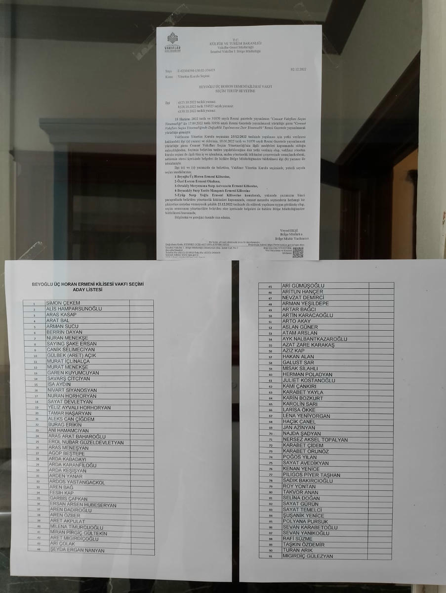 Beyoğlu Seçim Tertip Heyeti, Üç Horan Kilisesi’nin yanı sıra seçim sandıklarının Taksim Esayan Okulu, Ortaköy, Boyacıköy ve Eyüp Surp Yeğya kiliselerine kurulmasına karar verdi. Sandık yerleri VBM tarafından onaylandı. Ancak Toplum içinden sandık yerlerinin daha kapsayıcı olması için değiştirilmesine yönelik itirazların yapılması bekleniyor.