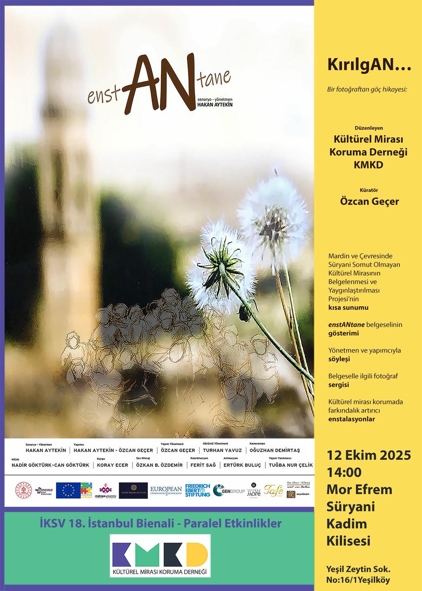 Kültürel Mirası Koruma Derneği (KMKD), İKSV’nin düzenlediği 18. İstanbul Bienali Paralel Etkinlikleri çerçevesinde üç ayrı proje ile yer alıyor. Projelerden biri de, 12 Ekim Pazar günü saat 14.00’te izleyicilerle buluşacak olan “KırılgAN” etkinliği. Yeşilköy Mor Efrem Süryani Kadim Kilisesi’nde yapılacak olan etkinlikte, EnstANtane belgeseli izletilecek, yönetmen ve yapımcı ile söyleşi yapılacak, ardından da avludaki sergi ve enstalasyon saat 17.00’ye kadar gezilebilecek.