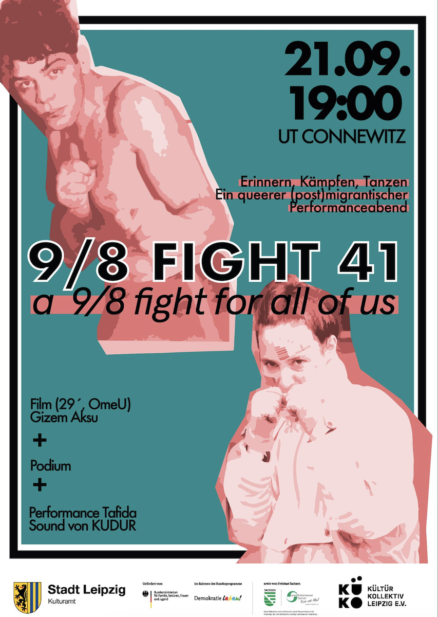 Bir süredir, Türkiye’den LGBTİ+’ları odağına alan filmlerin gösterimlerini yapan KÜKO, 21 Eylül Cumartesi akşamı, Leipzig’in çokkültürlü semtlerinden biri olan Connewitz’de, şehrin en eski sinema salonu olan UT Connewitz’de bir film daha gösterdi. Bir süre önce Berlin’e göç eden dansçı Gizem Aksu’nun yönettiği ‘9/8Fight41’ filmini izlemek için 100’e yakın kişi, bu tarihî salondaydık. Gecenin sunucuları Aslı Koruyucu ile Mavi Kotan, film ve gösterim sonrası yapılacak etkinlik hakkında bilgi verdikten sonra, yaklaşık yarım saat süren ve daha önce adını hiç duymadığım bir boksörün hikâyesini İstanbul’daki kentsel dönüşüme bağlayan filmi izlemeye başladık.