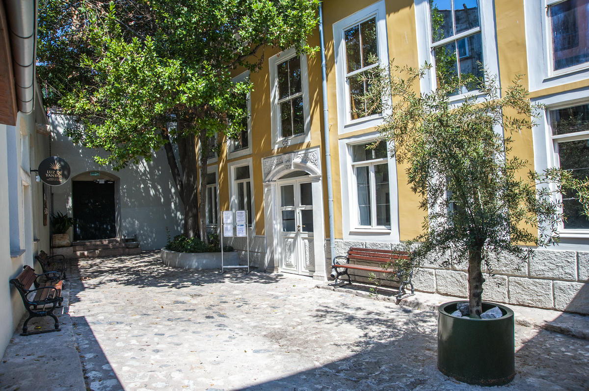 Avlusunda Bizans döneminden izler taşıyan Yanbol’da bir sinagog, sergi odası, mutfak ve ayin sonrasında kahvaltı yapmak için kış bahçesi yer alıyor. Avluda bizi, Seyfi İşman’ın imzasını taşıyan “Bulgaristan Yanbol’dan Balat Yanbol’a” isimli tablo karşılıyor.