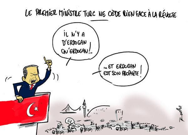 Karikatürde, Kelime-i Şehadet’e atıfta bulunuluyor, dönemin Başbakan’ının ağzından “Erdoğan’dan başka Erdoğan yoktur ve Erdoğan onun peygamberidir” deniliyordu.