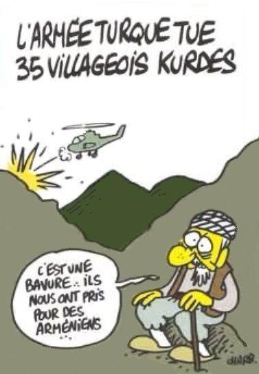 Karikatürde bir Kürt köylüsünü temsil eden karakter üzerinden yine Ermeni Soykırımı hatırlatması yapılıyor “Bu bir hata, bizi Ermenilerle karıştırdılar” deniliyordu.