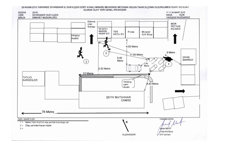 Olay yeri incelemesine göre hazırlanan 17 sayfalık bilirkişi raporunda, 1.75 santimetre boyunda olan Elçi'nin ayakta dik olarak durması, boynu zemine eğik olması, eğilmesi ve çömelmesi ihtimali ile zemine göre mesafe tespiti yapıldığı kaydedildi. Raporda, Elçi'nin ayakta dik durması kabulünde ense sol yan kısmındaki ateşli silah yarasının, zeminden dik olarak 160 santimetre, boynu zemine doğru eğik olarak 150 santimetre, eğilmesi sırasında 94 santimetre, çömelmesi kabulünde ise 89 santimetre olduğu belirtildi. Maktulün vurulma anında hangi baş ve vücut pozisyonunda olduğunun net bilinmediğini kaydeden bilirkişiler, tanımlanan vücut ve baş pozisyonlarının yapılacak ölçüm ve saptamalara örnek teşkil etmesi için seçildiğini kaydetti.