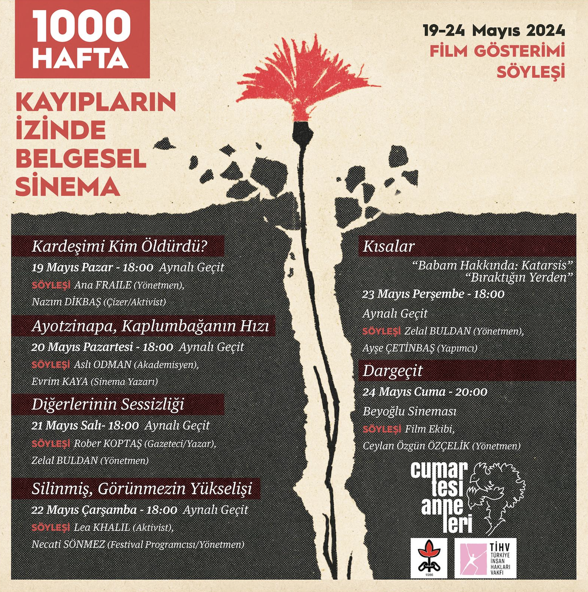 Cumartesi Anneleri, ‘Gözaltında Kayıplar Haftası/1000. Hafta’ etkinliklerini X’ten yaptığı paylaşımla duyurdu. 18 Mayıs Cumartesi, saat 18.00’de Adasanat’ta 24 sanatçının eserlerinden oluşan dayanışma sergisi ile başlayan etkinlik dizisinde dünyanın farklı ülkelerinden kayıp hikâyelerini anlatan ödüllü belgeseller, hafta boyunca izleyiciyle buluşacak. Ayrıca gösterimlerin ardından yönetmen ve konuklarla söyleşiler de yapılacak.