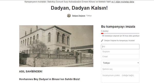Bakırköy Dzınunt Surp Asdvadzadzni Ermeni Kilisesi ve Mektebi Vakfı’na hitaben hazırlanan kampanyada, ‘170 yıllık tarihinde binlerce çocuğun eğitim yuvası olmuş güzelim okul binamızın parayı verenin düdüğü çaldığı bir ticarethaneye dönüştürülmesini istemiyoruz’ deniyor.