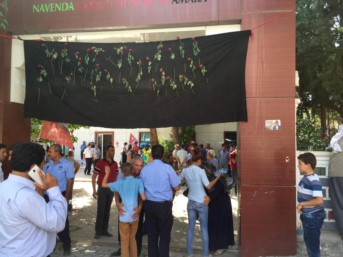 (SURUÇ) Yüzlerinde büyük bir acıyla oturuyorlar. Gördüğüm o yüz ifadelerinin tarifi zor. Ağızlarını bıçak açmadan oturan onlarca insan. Burası, Amara Kültür Merkezi, 32 genç insanın bir intihar saldırısı sonucu hayatını yitirdiği bahçe. Kültür Merkezi’nin girişinde belediye zabıtaları bekliyor, girişi kontrol ediyor. Zabıta ve HDP ve DBP’nin görevlendirdiği siviller içeri girip çıkan herkesi tek tek arıyor, çantalarına bakıyor. Kültür merkezinin giriş kapısına büyük bir siyah bayrak asılıyor, bayrağın üzerine de 32 tane gül...