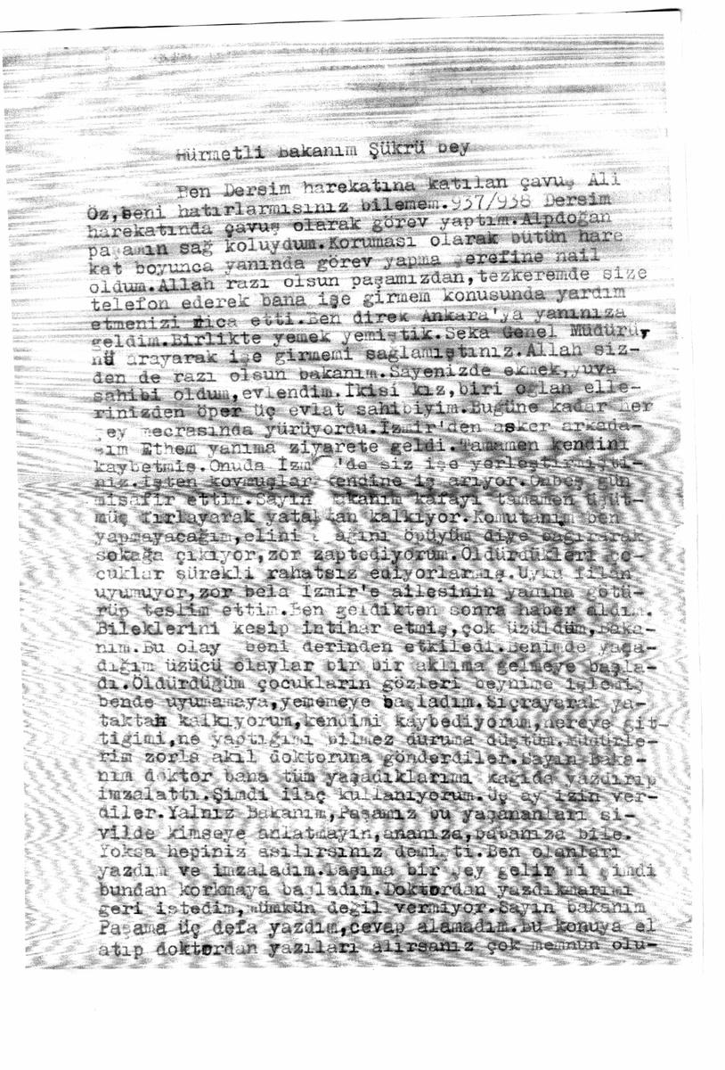 Ben Dersim harekâtına katılan Çavuş Ali Öz, beni hatırlar mısınız bilemem. 937/938 Dersim harekâtında çavuş olarak görev yaptım. Alpdoğan paşamın sağ koluydum. Koruması olarak bütün harekât boyunca yanında görev yapma şerefine nail oldum. Allah razı olsun paşamızdan, tezkeremde size telefon ederek bana işe girmem konusunda yardım etmenizi rica etti. Ben direk Ankara’ya yanınıza geldim. Birlikte yemek yemiştik. Seka Genel Müdürünü arayarak işe girmemi sağlamıştınız. Allah sizden de razı olsun bakanım. Sayenizde ekmek yuva sahibi oldum, evlendim. İkisi kız, bir oğlan ellerinizden öper üç evlat sahibiyim.