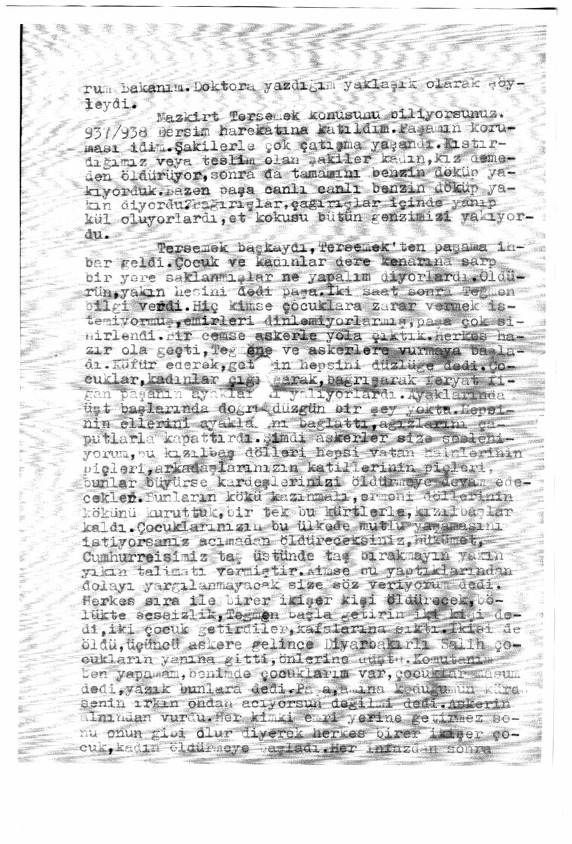 Mazkirt Tersemek konusunu biliyorsunuz. 937/938 Dersim harekâtına katıldım. Paşanın koruması idim. Şakilerle çok çatışma yaşandı. Kıstırdığımız veya teslim olan şakiler kadın, kız demeden öldürüyor, sonra da tamamını benzin döküp yakıyorduk. Bazen paşa canlı canlı benzin döküp yakın diyordu. Bağırışlar, çığırışlar içinde yanıp kül oluyorlardı, et kokusu bütün genzimizi yakıyordu.