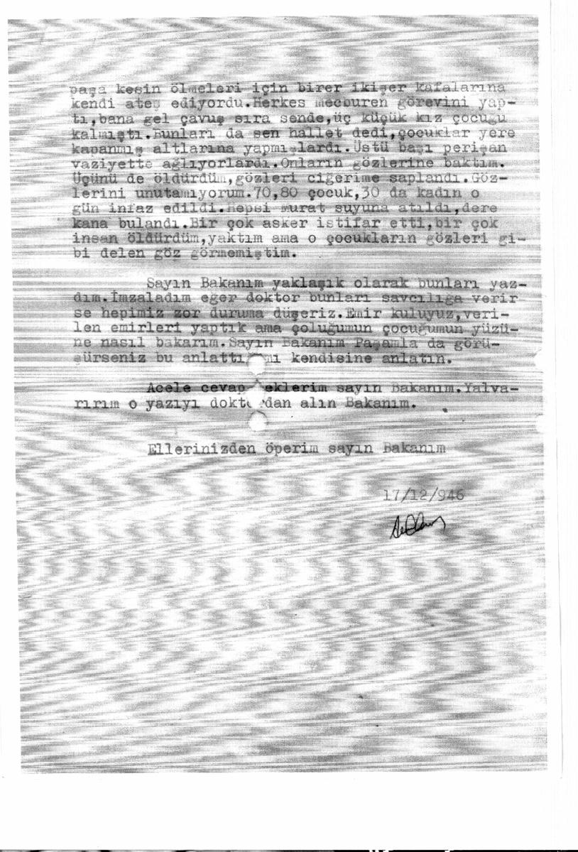Her infazdan sonra paşa kesin ölmeleri için birer ikişer kafalarına kendi ateş ediyordu. Herkes mecburen görevini yaptı, bana gel çavuş sıra sende, üç kız çocuğu kalmıştı. Bunları da sen hallet dedi, çocuklar yere kapanmış altlarına yapmışlardı. Üstü başı perişan vaziyette ağlıyorlardı. Onların gözlerine baktım. Üçünü de öldürdüm, gözleri ciğerime saplandı. Gözlerini unutamıyorum. 70, 80 çocuk, 30 da kadın o gün infaz edildi. Hepsi Murat suyuna atıldı, dere kana bulandı. Birçok asker istifar (istifra. TA) etti, birçok insan öldürdüm, yaktım ama o çocukların gözleri gibi delen göz görmemiştim.