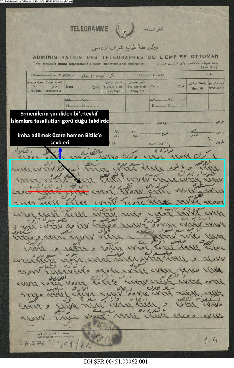 Bitlis Valisi için, Ermenilerin imhası vatanını selameti için kaçınılmazdır: İstanbul’a yazdığı bir telde, “mevcudiyetleri bünye-i vatan… için daima muzırr görülen bu unsurun [Ermenilerin] kuvva-yı maddiye ve maneviyesiyle imkân mertebesinde imhası selamet-i vataniye icabâtına göredir,” demektedir.