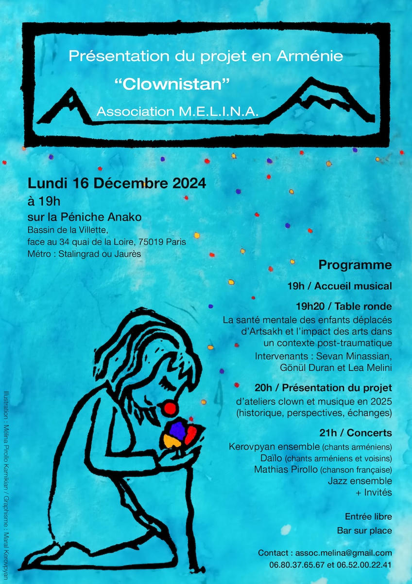"Palyaçoistan” projesi 16 Aralık Pazartesi günü Paris, Peniche Anako’da düzenlenen bir etkinlik serisiyle tanıtıldı. Raphaël Derderyan ve Mathias-Masis Pirollo Karnikian’nın müzik dinletisiyle başlayan tanıtım etkinliği, bir söyleşi ile devam etti. Söyleşiye İkinci Dağlık Karabağ savaşının ardından yerinden edilmiş çocukların ruh sağlığı, travma sonrası iyileşmede sanatın rolü, çocuklar ve ergenlerde göç ve travma gibi konular üzerine çalışan psikiyatrist Sevan Minassian, Klinik Psikolog Gönül Duran ve proje ekibi ile, müzisyen Lea Melini katıldı.