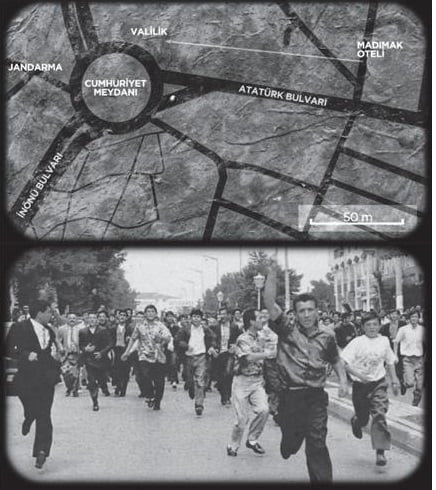 Ü.K. : Herkes dağılıyor. Ama orada iş bitmiyor. Valiliğe gidiyorlar. Valilikte vali yalnız başına duruyor. Valiliğe girmeye kalktıklarında, kalabalığa ateş açılıyor ve iki kişi ölüyor. Meselâ bu da çok acayip değil mi? O iki kişi kim? Niye kimse onların hesabını sormuyor? Onlar o kalabalıktan iki kişi. Nasıl öldü bu insanlar? Kim öldürdü onları? Ne yaparken oldu bu iş?
