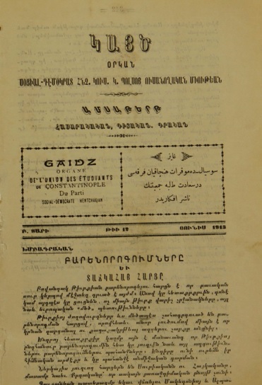 Gaydz’ın ilk döneminde vurgunun bilim ve felsefe akımlarının tanıtılması ve özellikle de bunların bilimsel sosyalizme bir arkaplan oluşturması üzerine olduğunu görüyoruz. Ama bu dönemde de siyasetin yokluğundan bahsedemeyiz, sonuçta Gaydz bir partinin, SDHP’nin, öğrenci örgütünün dergisi ya da daha doğru bir ifade ile dergi ve yayın kurulu öğrenci örgütü gibi davranıyor. Bu yüzden derginin hem kendi yayın politikasının varlığından bahsedebiliriz hem de bunun partinin siyasetiyle eşgüdümlü olduğu söyleyebiliriz. Mesela 1912 yılının ortalarında bir sayıda gençlere ‘bağımsız’ ya da ‘tarafsız’ öğrenci birliklerinden uzak durulması öğütleniyor. Ama ikinci dönem olarak adlandırabileceğimiz dönemle bu ilk dönem arasında önemli bir fark var, o da partinin görünürlüğüne ve dergiyi takip eden öğrencilerin parti faaliyetleri içinde olması gereken yerlere dair görüşler. Bu açıdan birinci dönemi bilimselliğin oluşması yani teori ve ikinci dönemi siyasi analizler ve sahaya inme yani pratik olarak kabaca ayırabiliriz. Kabaca dememin de iki sebebi var ama. Birincisi, ilk dönemde de yukarıda belirttiğim gibi tabii ki siyasete vurgu var. İkinci olarak da bu geçişleri anlamamız için bunları hem dönemin sosyalizm ve siyaset arasındaki ilişkileri hem de özel olarak Hınçak Partisi’nin teorik çerçevesi ve pratikleri içinde düşünmemiz gerekmesi. Mesela öğrenciler için ‘entelektüel proleterya’ kavramının kullanılmaya başlandığını görüyoruz. Bunun teoride de pratikte de yeri ve önemi var ya da olmalı. Böyle dönüşümleri anlamak için araştırmalara ihtiyacımız olduğunu düşünüyorum, bu yüzden ihtiyatlı biçimde ‘kabaca’ demeyi daha uygun gördüm.