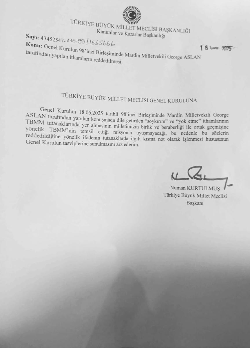 Ancak Kavuncu'nun paylaştığı belgede TBMM Başkanı Kurtulmuş'un TBMM(den Aslan'ın sözleri için "TBMM tutanaklarında yer almasının milletimizin birlik ve beraberliği ile ortak ile ortak geçmişine yönelik TBMM'nin temsil ettiği misyonla uyuşmayacağı, bu nedenle bu sözlerin reddedildiğine yönelik ifadenin ilgili kısma not olarak işlenmesini" talep ettiği görülüyor.