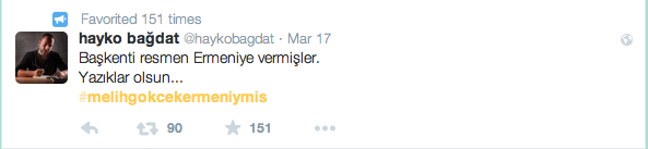 Ankara Büyükşehir Belediye Başkanı Melih Gökçek’in avukatı, müvekkilinin Twitter üzerinden kendisine iftira ve hakarette bulunduğu, ayrıca halkı kin ve düşmanlığa tahrik ettiği iddiasıyla gazeteci Hayko Bağdat'tan şikayetçi oldu ve 10 bin liralık manevi tazminat davası açtı.