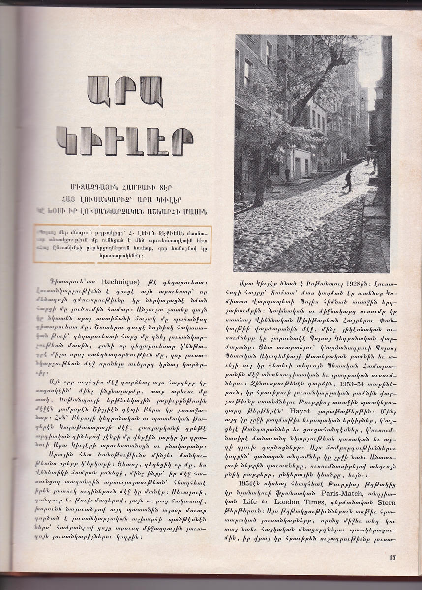 Beyrut’ta, Haygazyan Üniversitesi’nin kütüphanesinde, kütüphane görevlisi Vera Gosdanyan’ın yardımıyla ‘Hay Indanig’ dergisini bulabildim. 49 yıl aradan sonra aynı dergiyi tutuyordum elimde; Ara’yla ilgili yazı da, bir zamanlar Ermeni ve Rum mahallesi olan Tarlabaşı’ndaki arnavut kaldırımı sokağın siyah beyaz-fotoğrafı da oradaydı işte. Bu fotoğrafın üzerimde nasıl, hiç silinmeyen bir etki bırakan yarattığını, minnettarlığımı ona tam olarak ifade edemedim. Çalışmalarının yarattığı etkiyi öğrenmekten kaçınırdı; hiçbir şeyi umursamadan, sadece, özgürce fotoğraf çekmek isterdi.