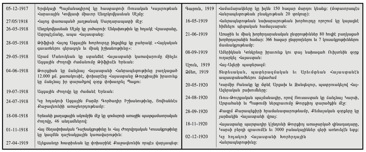 Հայաստանի առաջին հանրապետութիւնը ունեցած է կարճ կեանք։ Երեք տարիէն քիչ պակաս տեւողութիւն ունեցած պետութիւնը ունեցած է վարչապետ, խորհրդարան, դեսպաններ։ Ստորագրած է միջազգային պայմանագիրներ, նուաճած է ռազմական յաղթանակներ, հասած է 70 հազար քմ. տարածքի, կրած է պարտութիւններ, եւ ի վերջոյ տեղի տուած ու ենթարկուած Խորհրդային շարքերուն։ Առաջին հանրապետութեան պատմութիւնը այսօր մեզի շատ բան կ՚ըսէ անկախութեան եւ պետականութեան մասին, ուստի ստորեւ կը ներկայացնենք հակիրճ ցանկ մը հանրապետութեան համար կարեւոր թուականներու:
