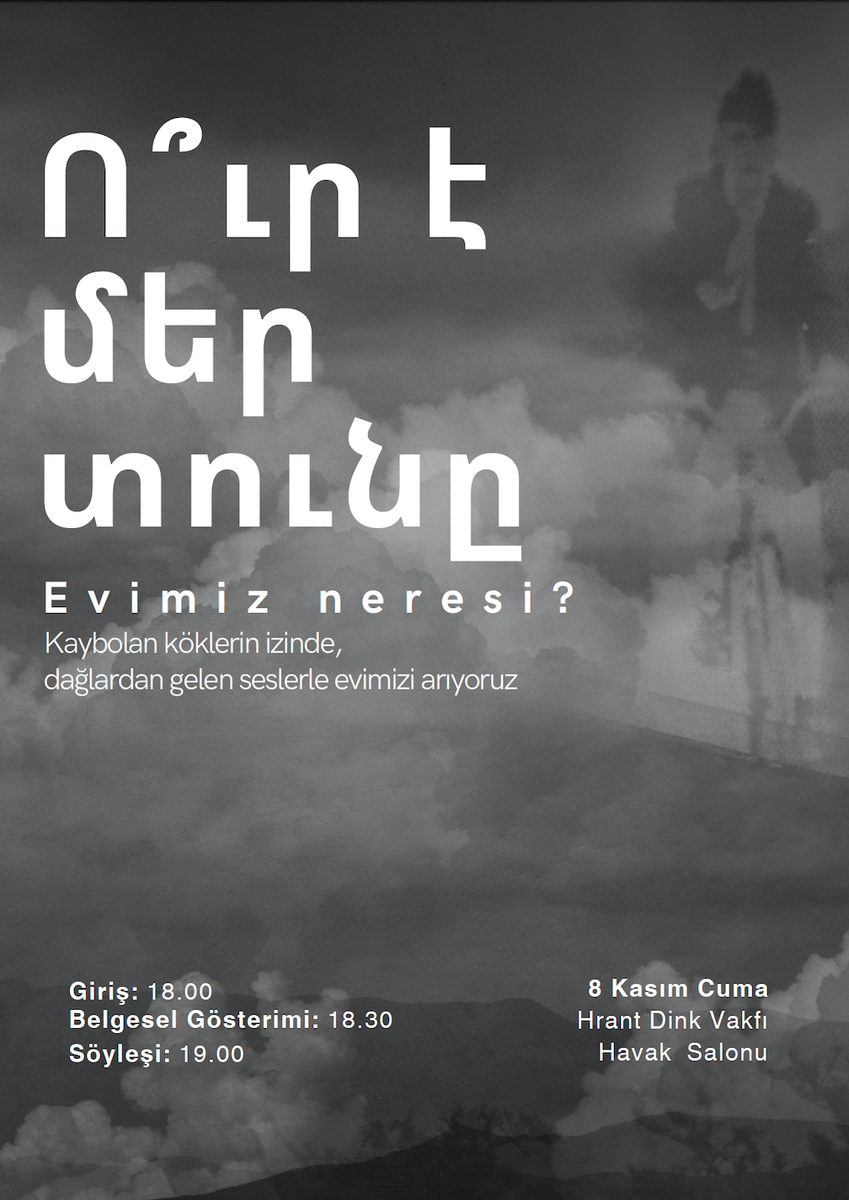 Bağımsız tiyatro topluluğu Hangardz, bu kez bir belgeselle izleyici karşısına çıkıyor. Belgesel projesi, topluluğun, Haziran 2024’te Ermenistan’ın Yerevan ve Vanadzor şehirlerinde Batı Ermenicesiyle sahnelediği ‘Yüreğim Dağlardadır’ oyununun turnesi sırasında oluştu. Gösterimlerin ardından topluluk üyelerine yöneltilen “Ermenistan’da kendinizi evinizde hissettiniz mi?” sorusu çerçevesinde şekillenen ‘Evimiz Neresi’ adını taşıyan belgesel, ilk gösterimini 8 Kasım Cumartesi günü saat 18.30’da, Hrant Dink Vakfı Havak Salonu’nda yapacak.