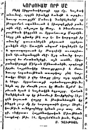 İstanbul’da Aravod (Sabah), Cagadamard (Muharebe), Azadamard (Hür Mücadele), Püzantiyon (Bizans), Joğovurt (Halk), Adana’da Hay Tsayn (Ermeni Sesi), New York’ta Hayrenik (Vatan), Mısır’da Arev (Güneş), Yunanistan’da Alik (Dalga), Arjantin’de Armenia (Ermenistan), Romanya’da Nor Arşaluys (Yeni Şafak), Bulgaristan’da Zank (Zil/Çan) ve benzeri birçok gazete sanki sözleşmiş gibi yıllarca bu üç kelimeyi kullandı. Bu başlıklar altınca binlerce duyuru yayınlandı, zaman zaman aynı duyuru arka arkaya birkaç gün, bazıları da aylar boyunca devam etti. Hiçbir gazete bu duyurular için ücret almadı. Amaç; kişiler, kurumlar ve özellikle de bu duyurular aracılığıyla 1915 kurbanlarının yakınları arasında dayanışma ve bilgi alışverişini sağlamak, kaybolmuşları birbirine kavuşturmaktı.