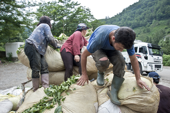 Gürcistan’dan gelen işçilere her yerde rastlamak mümkün. İşleri oldukça ağır. Çay tarhları çoğu kez sarp yamaçlara kurulu. Gün boyu dikenli çalılar arasında, çamur içinde, yakıcı güneşin altında çalışmak hiç kolay değil. Yaprakları kesip çuvallara doldurmak, sanki hiç bitmeyecek bir iş izlenimi veriyor ilk başta. Ama üç işçi gün akşama kavuşuncaya kadar bir ton çay yaprağını toplamış oluyorlar. Sekiz yıl önce, Şafak’ın annesi Ayşe de Gürcü işçilerle birlikte durmaksızın çalışırdı. Onlarla ter döker, yemek molalarında da onlarla birlikte yer sofrasına otururdu. Komşu evlerin kadınları da hemen hemen aynı düzende çalışırlardı. Bu kez Ayşe artık çay toplamaya çıkmıyor. Gününü üç yaşındaki torununun ve hasta annesinin bakımı ile geçiriyor. Bir de Gürcü işçilerin kahvaltı ve öğlen yemeklerini hazırlama görevi var. Bu da kolay bir iş değil. Sait ve Çetin her sabah, henüz güneş doğmadan, saat 04.00- 04.30 sularında Gürcistan sınırına gidip işçileri alıyorlar. Onlar geldiğinde kahvaltı hazır olmalı. Çay toplama mesaisi saat 05.00- 05.30 gibi başlamak zorunda. Akşam, mesai saatinin sonunda işçiler tekrar sınır kapısına götürülüyorlar. Herkes akşam yemeğini evinde, ailesiyle yemeli. Dikkatimi çeken ise bu çileli çalışma organizasyonundan kimsenin şikâyetçi olmayışı. Gürcü işçilerle konuştuğumda hallerinden memnun olduklarını söylediler. “Bizim oralarda işsizlik var. İş bulsan dahi günlük kazancın 60 TL civarında. Burada günde 200 TL’ye yakın kazanıyoruz. İşimiz yorucu ve ağır. Ama altından kalkıyoruz çok şükür. Böylece çoluğun, çocuğun geçimini sağlayabiliyoruz”. İşin püf noktası ise ücretlendirme sisteminde. Eskiden Gürcü işçiler yevmiye ile çalışıyordu. Şimdi ise Sait ve Çetin toplanan ürün üzerinden, kilo başı 65 kuruş ödüyorlar. Bu da onların daha verimli çalışmasına, işten kaytarmamalarına yol açıyor.