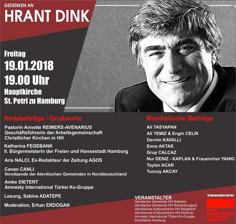 - Hamburg’da Hrant Dink anma etkinliği St.Petri Kilisesinde gerçekleşecek. 19 Ocak’ta saat 19.00’da başlayacak etkinliği Rosa Luxemburg Vakfı katkısıyla, Hamburg’daki alevi kurumları , Uluslar arası Af örgütü ve Düşünce Fabrikası Hamburg düzenliyor.