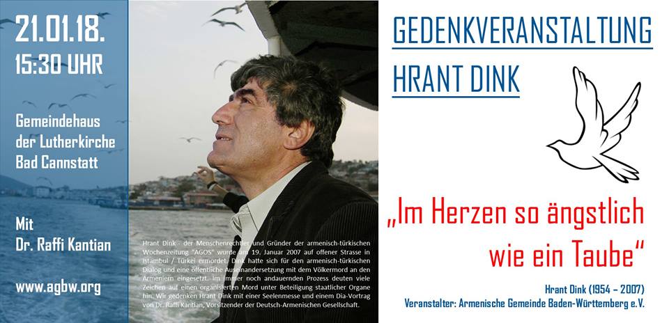- Almanya, Baden-Württemberg şehrindeki Ermeni toplumu, Hrant Dink’i 21 Ocak’ta bir kilise ayiniyle anacak. Saat 13.00’te Luther Kilisesi’nde yapılacak törenin ardından Dr. Raffi Kantian’ın da bir konuşması olacak.