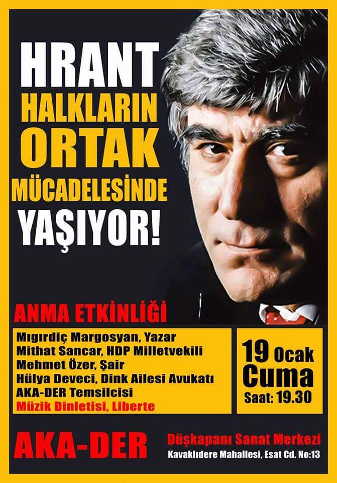 AKA-DER, 19 Ocak cuma günü "Hrant Halkların Ortak Mücadelesinde Yaşıyor" başlıklı bir panel düzenleyecek. Düşkapanı Sanat Merkezi’nde yapılacak ve saat 19.30'da başlayacak etkinlikte