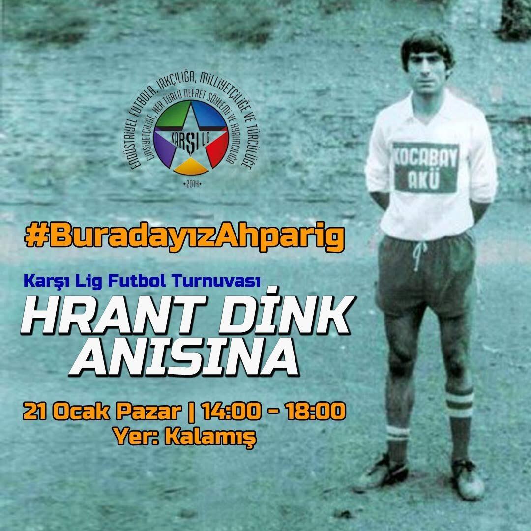 Karşı Lig, Pazar günkü maçını Hrant Dink anısına oynayacak. #BuradayızAhparig etiketiyle sosyal medyada paylaşılan turnuva, 21 Ocak Pazar saat 14.00-18.00 saatleri arasında Kalamış'ta düzenlecek.