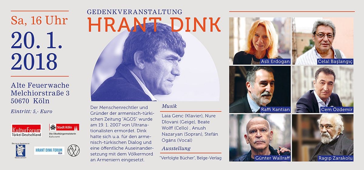 Türkiye-Almanya Kültür Forumu, 20 Ocak'ta Köln'de bir Hrant Dink anması düzenliyor. Köln Alte Feuerwache'de yapılacak anma etkinliğine Aslı Erdoğan, Cem Özdemir, Raffi Kantian, Celal Başlangıç, Günter Wallraff ve Ragıp Zarakolu katılacak.