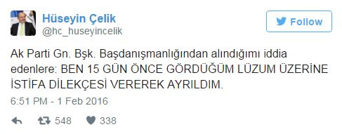 Hüseyin Çelik Twitter üzerinden yaptığı açıklamada “Ak Parti Genel Başkan Başdanışmanlığından alındığımı iddia edenlere: Ben 15 gün önce gördüğüm lüzum üzerine istifa dilekçesi vererek ayrıldım” ifadelerini kullandı.
