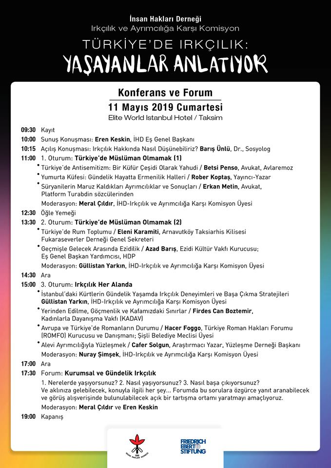 İHD Irkçılık ve Ayrımcılığa Karşı Komisyon olarak düzenleyeceğimiz Panel-Forum etkinliği ile bugün Türkiye olarak anılan topraklarda gerek kurumsal olarak, gerekse gündelik hayatta ırkçılığa, düşmanlaştırılmaya, insandışılaştırılmaya, görünmez kılınmaya, ekonomik, kültürel ve siyasi kaynaklardan mahrum bırakılmaya maruz kalanların yaşadığı deneyimleri tartışmaya açmayı amaçlıyoruz.