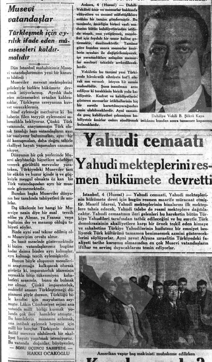 ‘’Yahudiler arasında Türkleşme yolunda yeni kararlar verilmektedir. Yahudi mektepleri varidatlarıyla hükümete devredilecektir. Yahudiler kendi isimlerini de değiştirmek istemektedirler. Bunun için hükümete müracaat edeceklerdir. Yahudi münevverleri beyanatlarında, Türkleşme işinde geciktiğimiz şikâyetleri haklıdır, yakında harekete geçeceğimizi göreceksiniz denmektedir.’’