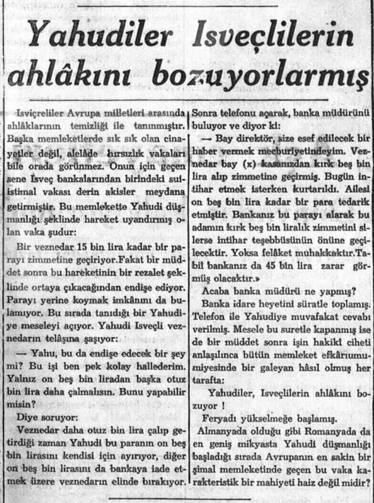 Yeni Asır Gazete (1938) Yahudiler İsveçlilerin Ahlakını Bozuyormuş, 13 Ocak, 1938, s. 7, Süreli Yayınlar Grubu, Yeni Asır Cilt.167, İzmir Ahmet Piriştina Kent Arşivi ve Müzesi Veritabanı
